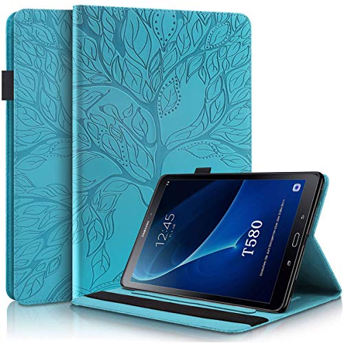 Ailisi Cover Per Samsung Galaxy Tab A 10.1 (2016) SM-T580/SM-T585, Elegante Disegno in rilievo con albero e farfalla Flip Case Custodia Protettiva in Pelle con Supporto, Slot per schede -Blu verde