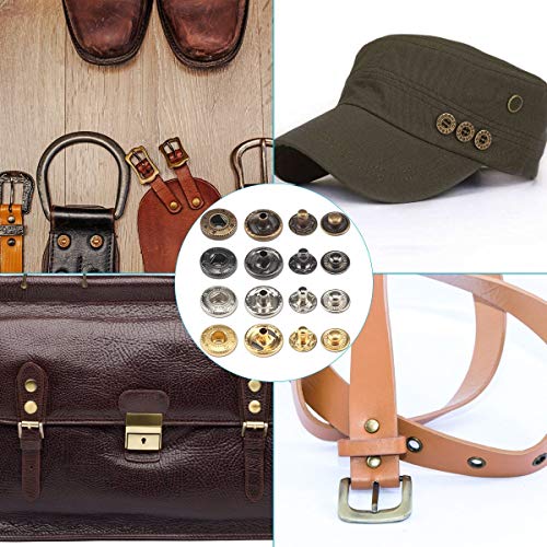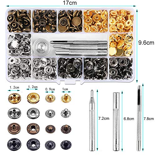 Kit di bottoni a pressione per un'ampia applicazione: questi utili si agganciano sono ideali per la fabbricazione di vestiti, lavori manuali, ornamenti di cucito su camicie, giacche, salopette, zaini, scarpe, cappelli, cinture, scarpe in pelle di abbigliamento, jeans, e così via. Sono facili da fare un fai da te.