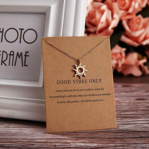 SOLO GOOD VIBES: Ispirato al sole. Il sole simboleggia l'eternità, la luce, la vitalità, la prosperità, il calore e la speranza. esprimi un desiderio e indossa la tua collana. ogni giorno ha qualcosa da festeggiare. indossa la tua collana come promemoria per sorridere, rimanere positivo e lasciare entrare il sole.