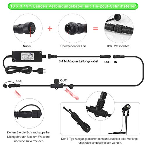 Illuminazione da giardino fai da te con cavo: design flessibile, su ogni cavo di collegamento si trovano tre interfacce, che possono essere disposte a seconda delle necessità. Vedere la figura 5 per i dettagli. La lampada da giardino migliorata ha un cavo di collegamento lungo 31,5 m. La lunghezza totale dei 10 spot da giardino può raggiungere i 31,9 m se sono collegati in linea retta.