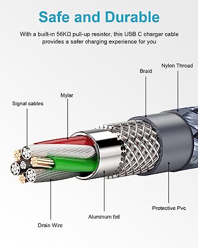 【Sicuro e Affidabile Cavo USB C Ricarica Rapida】Il resistore integrato da 56K ohm e le schermature multiple del cavo tipo c ricarica rapida riducono la perdita di segnale, garantiscono la stabilità della ricarica rapida, proteggono i dispositivi da sovratensione, sovracorrente, sovraccarico e cortocircuito -circuito.