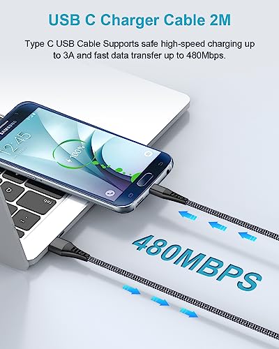 【Cavo USB C 2 Metri】2 Pezzi cavetto USB C tuta per cavi varie distanze di ricarica per ogni occasione, casa, ufficio, auto e così via. Inoltre, è dotato di trasferimento dati a 480 Mbps, il che significa che è possibile trasferire dati tra due dispositivi con facilità.( NOTA: NON Supporta Huawei SuperCharge, OnePlus DASH Charge.)