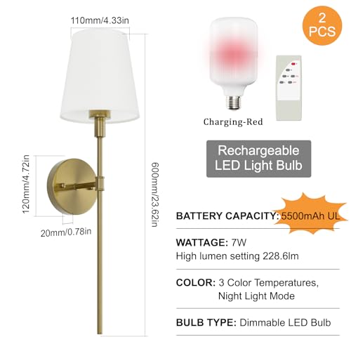 Aipsun 5500mAh Applique da Parete Interno Dimmerabile Batteria Operata, 2PCS Lampada da parete Senza Fili con Telecomando, Lampada da Muro Batteria Ricaricabile USB,3 Modalità di Colore, Oro