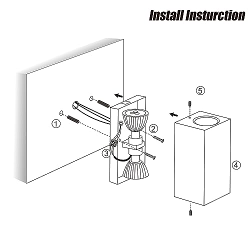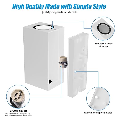 [Facile installazione e sostituzione] Basta seguire le istruzioni di installazione fornite con la nostra confezione, utilizzare viti per installare e fissare la lampada da parete alla parete, collegare il cavo di alimentazione e smontare il guscio. Installare lampade GU10 su e giù (supporto massimo 50W), e è possibile installare questa lampada da parete GU10 esterno (Nota: il prodotto non contiene lampadine GU10)