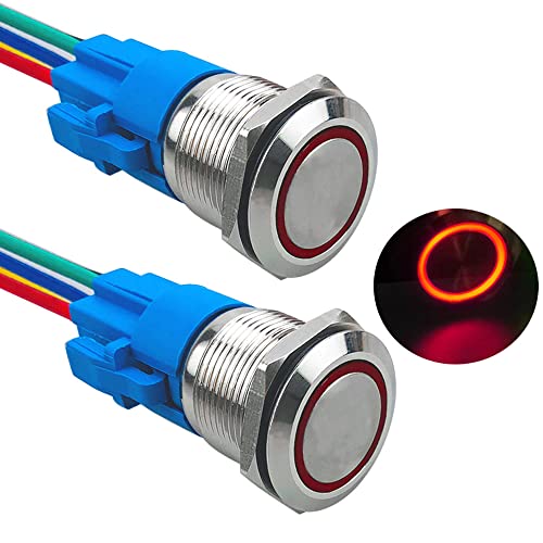 Aiqeer 2 Pezzi 19 mm Interruttore a Pulsante Momentaneo, 12V / 24V 5A Interruttore di Accensione per Auto, Interruttore a Pulsante in Metallo con Presa Precablata (LED Rosso)