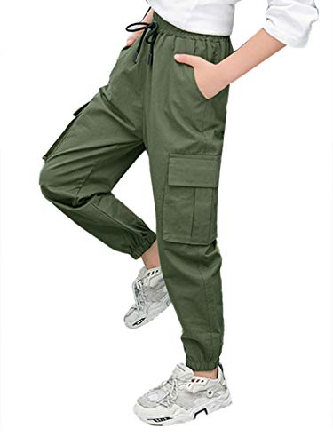 Aislor Cargo Pantaloni Lunghi in Cotone Bambina Pantalone Casual con Tasche Tinta Unita Ragazza Pantaloni Sportivi con Cintura Elastica Jogging Corsa Danza Strada Hip Hop Marina Verde 5-6 Anni
