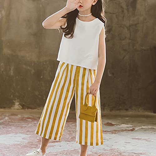 Aislor Completi Estivi Ragazza in Cotone Completini Coordinati Estate Bambina Crop Top Tinta Unita T-Shirt Senza Maniche + Pantaloni Larghi a Righe/Pois Pantaloni Lunghi Giallo 7-8 anni