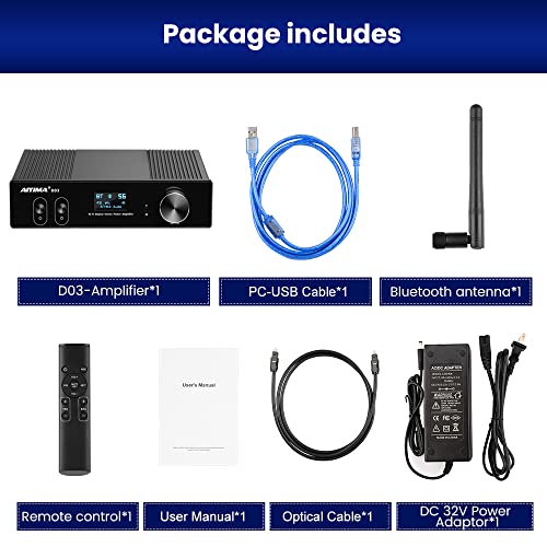 Otterrai: 1 * amplificatore D03, 1 * telecomando, 1 * antenna Bluetooth, 1 * adattatore di alimentazione, 1 * cavo USB, 1 * cavo ottico. Nota: c'è una pellicola protettiva sulla superficie della macchina, tu può strappare la pellicola protettiva per renderla più bella in base alle proprie preferenze.