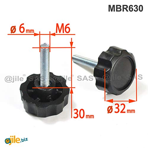 Ajile - Manopola Filettata NERA Con Testa a Stella in Plastica di Diametro 32 mm - Stelo Filettato in Acciaio Zincato di Diametro M6 e Lunghezza 30 mm - Sacchetto di 8 Pezzi - MBR630x8-FBA