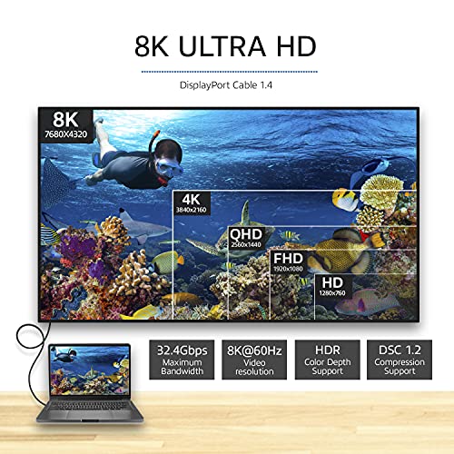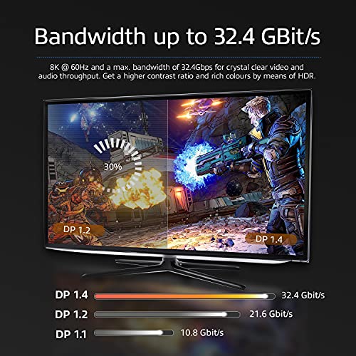 Display video: il cavo DP supporta una risoluzione fino a 8 K (7680 x 4320), 4K Ultra HD (3840 x 2160), 2K e 1080p. Adatto per streaming video Ultra HD. Frequenza di aggiornamento elevata da 8 K a 60 Hz e 4 K a 120 Hz.