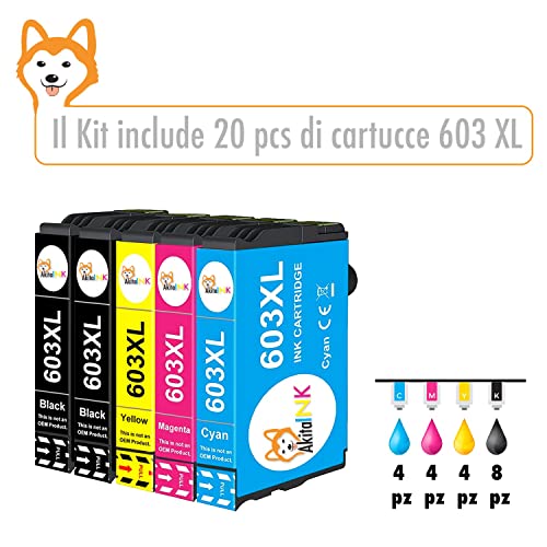 AkitaINK Multipack 20 Cartucce d'inchiostro 603 XL 603XL compatibili con Epson Home XP-2100 XP-2105 XP-3100 XP-4100 Workforce WF-2810 WF-2830 WF-2850 (8 nero, 4 ciano, 4 magenta, 4 giallo)