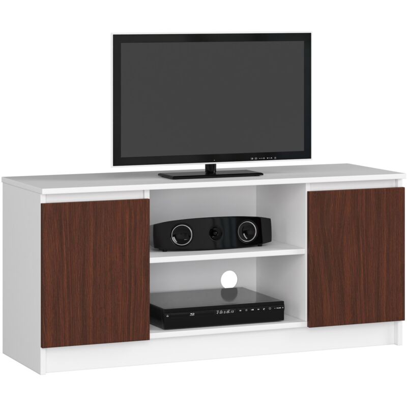 Mobile TV AKORD Bianco 120 cm 2 porte Colore frontale Wengé 120x40x55 cm Il mobile TV AKORD è una scelta elegante e funzionale per il tuo spazio multimediale. Con il suo design raffinato e i materiali di alta qualità, questo mobile aggiunge un tocco di stile al tuo salotto o alla tua camera da letto. Le due porte a sinistra e a destra nascondono ripiani spaziosi, ideali per riporre CD, DVD e altri dispositivi multimediali, mantenendo l'ambiente ordinato e organizzato. Il vano ripiano aperto è perfetto per posizionare decoder TV, console di gioco o oggetti decorativi. Completa il tuo arredamento con il mobile TV AKORD e goditi il massimo comfort e funzionalità nel tuo spazio multimediale. • Mobile TV moderno: dimensioni ottimali H55 x L120 x P40 cm, laminato, robusto pannello per mobili 16 mm, due ripiani con ante senza maniglia a sinistra e a destra, tra un ripiano aperto, robuste cerniere metalliche. • Costruzione robusta: la cassettiera è realizzata con pannelli di mobili laminati