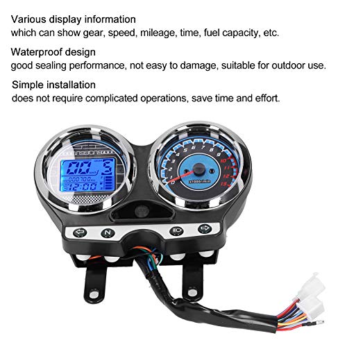 Prestazioni superiori - Design impermeabile, buone prestazioni di tenuta, non facile da danneggiare, adatto per uso esterno. Schermi a doppio display, display digitale a sinistra, display puntatore a destra, varie informazioni sul display, in grado di visualizzare marcia, velocità, chilometraggio, tempo, capacità del carburante, ecc. Consente di trovare rapidamente le informazioni necessarie.