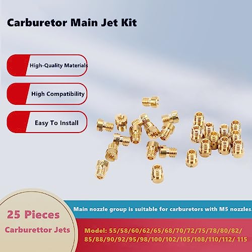 【Più dimensioni】: è disponibile un ugello principale del carburatore da 25 pezzi, inclusi i seguenti modelli: 55/58/60/62/65/68/70/72/75/78/80/82/85/88/90/92/95 /98/100/102/ 105/108/110/112/ 115.