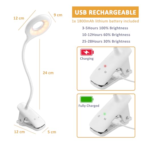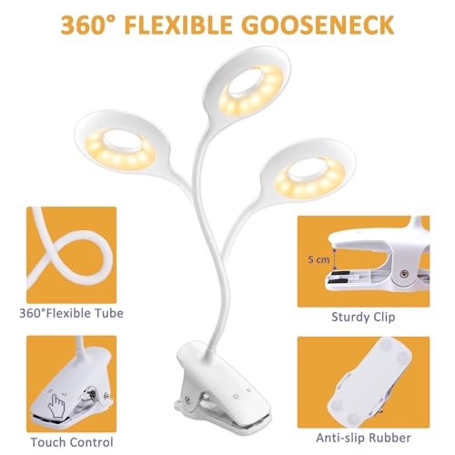 Akynite 3W Lampada da Lettura Letto Ricaricabile con Pinza, 28 LED, Lampade da Comodino Senza Filo, 3 Colore e 3 Intensità, Lampada da Scrivania Touch a Pile, Mini Luce Notturna da Lettura, Bianco