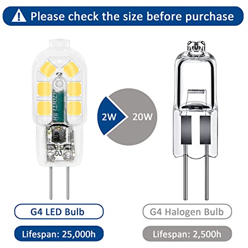 ★【G4 12V LED】: Non può essere installato direttamente nel sistema di illuminazione AC 100V-220V, una tensione errata causerà cortocircuiti o danneggerà la lampadina. La lampadina non è dimmerabile. L'uso di dimmer può causare sfarfallio o rumore.
