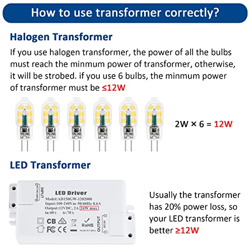 ★【Trasformatore】: Assicurati che il trasformatore sia compatibile con il LED G4 12V, l'incompatibilità causerà sfarfallio. Se si utilizza un trasformatore tradizionale, tutte le lampadine collegate devono raggiungere la potenza minima di uscita del trasformatore. Adatto per cappe da cucina.