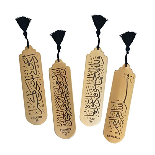 Segnalibri in metallo: i segnalibri in metallo sono impostati in Basmala, A'raf 180, Tırmızı De'avat 83, Ghafir 60 calligrafie. Ogni segnalibro è stampato su metallo dorato e ha una delicata nappa.