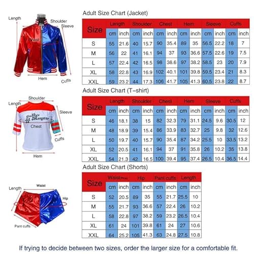 【Dimensioni】Harley Donne Cosplay Costume Disponibile in cinque taglie:S,M,L,XL,XXL.La taglia è di taglia asiatica, potrebbe essere troppo piccola, fare riferimento alla tabella delle taglie e scegliere il costume cosplay Harley giusto.