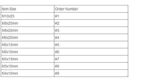 Formato: M10x25, M8x25mm, M8x20mm, M6x20mm, M6x13mm, M6x10mm, M5x13mm, M5x10mm, M4x10mm