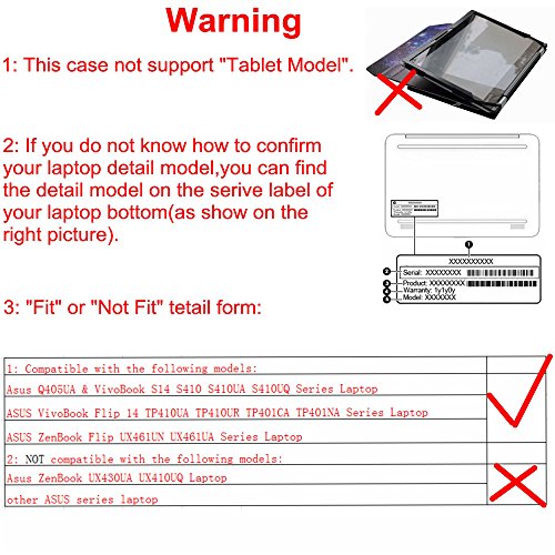 Questo caso non e 'un portatile borsa universale,ogni caso è utilizzabile solo per alcuni modelli soprattutto portatile.Adatto per 14" Asus VivoBook S14 S410 S410UA S410UQ & VivoBook Flip 14 TP410UA TP410UR TP401CA TP401NA & ZenBook Flip UX461UN UX461UA Series Portatile.(come TP410UA-EC386T,TP410UA-EC468T,TP410UA-EC305T,TP410UA-EC323T,TP410UA-DS71T TP401NA-BZ020T,ecc.)