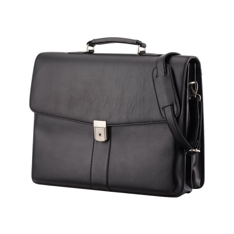 Cartella Alassio con manico e tracolla removibile, serratura, scomparto frontale con cerniera, scomparto principale, tasca per biglietti da visita, due portapenne e una tasca per smartphone. Dimensioni 41x31x12,5 cm. Similpelle, nera.