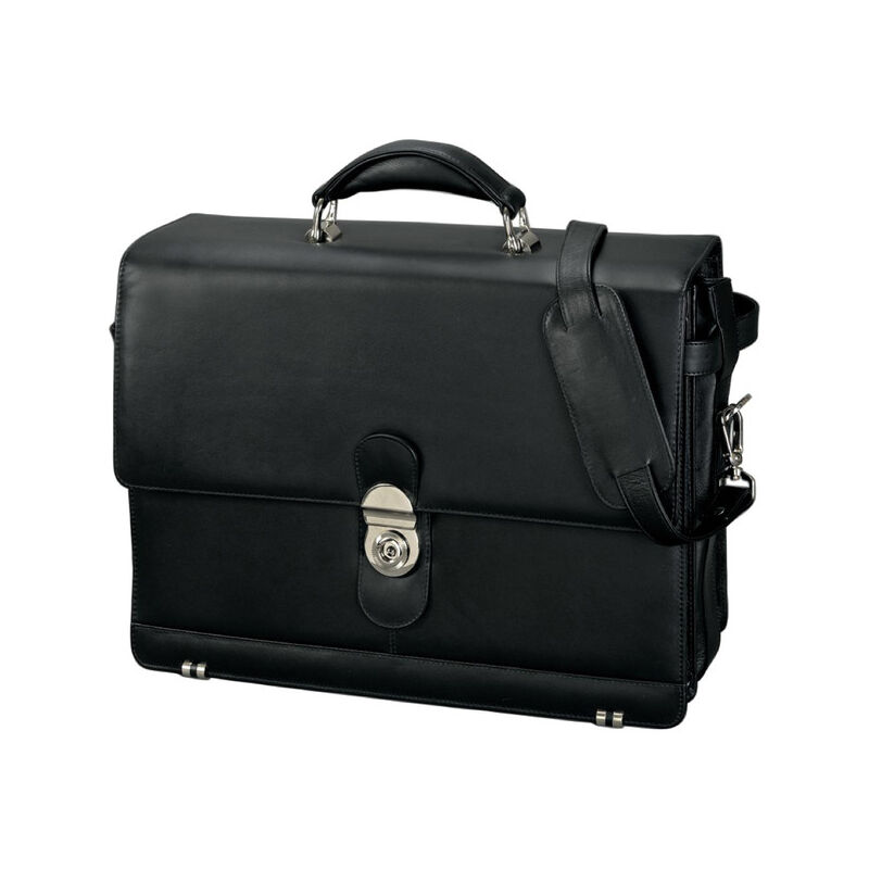 Cartella Alassio con tracolla removibile e serratura. Finiture interne: scomparto imbottito per laptop, scomparto principale e scomparto con cerniera, tasca organizer con due portapenne e scomparto per smartphone. Dimensioni 31x38,5x17 cm. Vera pelle. Colore nero.