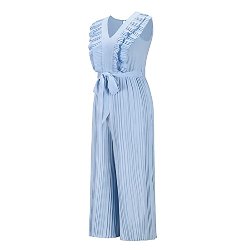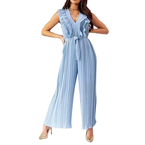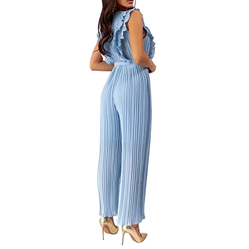 Alaurbeauty Tuta da donna elegante estiva con scollo a V, volant, plissettata, con vita alta e gamba larga, senza maniche, formale, A-azzurro, S