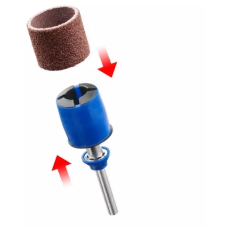 Alberino DREMEL per Cilindri Abrasivi di Diametro 13 mm . Questo tipo di Alberino permette un cambio molto rapido del Cilindro levigante, basta infatti tirare, posizionare e poi spingere il Cilindro . Nella confezione sono compresi già 2 cilindri ( 1 con Grana 60 e 1 con Grana 120 ) Misure: Diametro Gambo 3.2 mm Diametro di lavoro 13 mm