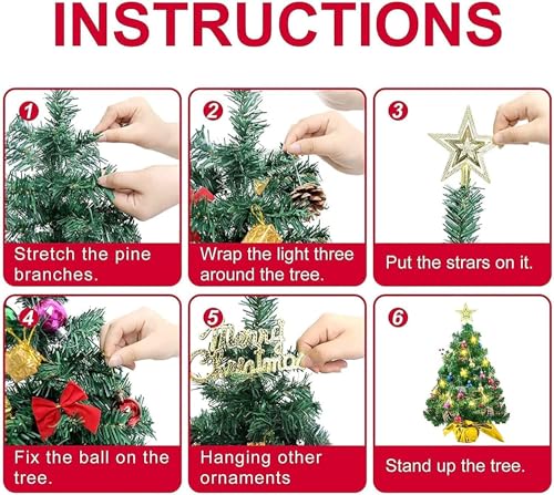 Facile da regolare: solo pochi semplici passaggi: 1. Estrarre il piccolo albero di Natale e aprire i rami. 2. Appendi tutti gli accessori fai da te. 3. Posiziona il mini albero di Natale sul davanzale della finestra, sulla scrivania, sul piano di lavoro o in qualsiasi luogo.