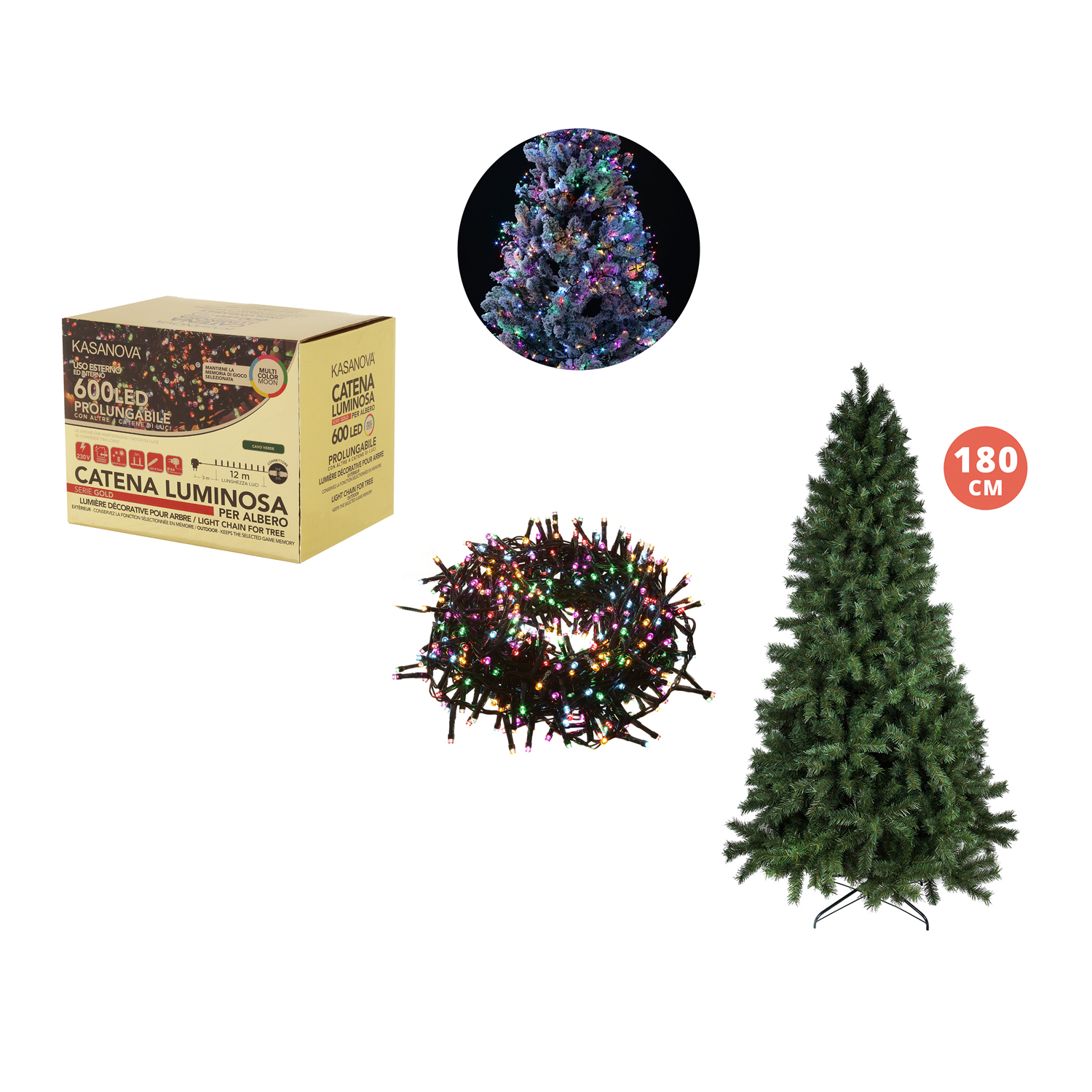 A Natale non può di certo mancare un bell'albero addobbato attorno al quale riunire tutta la famiglia per scartare i regali. Il modello artificiale della linea Sestriere è realizzato in resistente plastica che rende l'albero realistico, ma evitando di sporcare il pavimento come farebbe un vero abete con i suoi aghi. Composto da 652 folti rami verdi con apertura ad innesto, potrai decorarlo con il filo di luci incluso nel set. La catena luminosa a luce colorata renderà l'atmosfera più gioiosa! Adatto sia per interno che per esterno, il filo di luci con 600 mini lucciole led è facile da posizionare sui rami dell'albero ed è completo di connettore per essere prolungato, all'occorrenza, con altre 4 catene di luci. Grazie al controller integrato puoi impostare e memorizzare 8 diversi giochi di luce per un effetto davvero suggestivo. La catena di luci copre 12 metri ed è composta da cavo verde di 3 metri. L'albero è alto 180 cm.