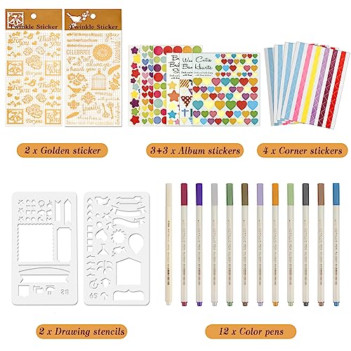 【Kit per scrapbook】: riceverai un album fotografico (nero), 12 adesivi con quattro tipi, 2 stampi per dipingere, 12 Penne Colorate. Dimensioni 26.5*21*4cm, totale 30 fogli (60 pagine). Contiene 60-360 foto, il numero di foto dipende dalla dimensione delle foto.