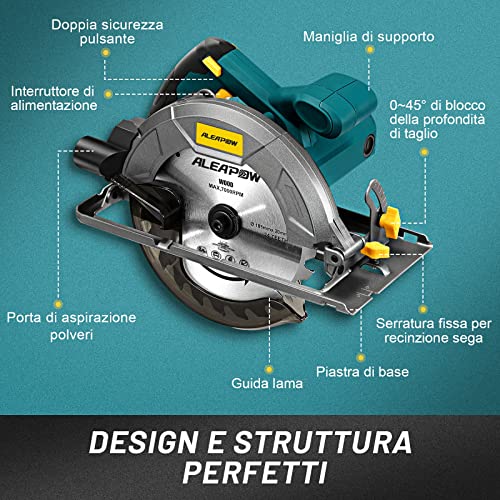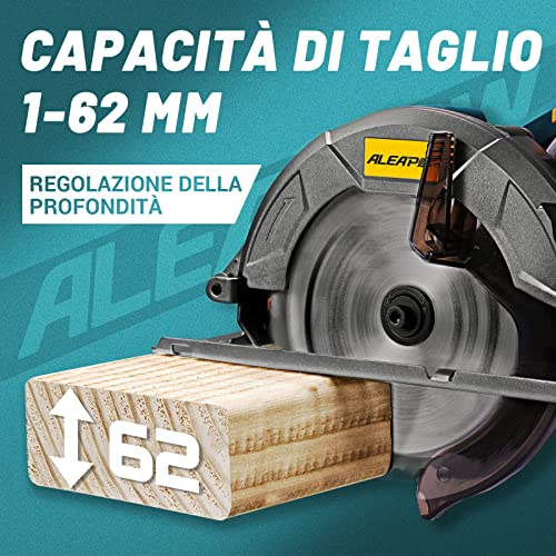 ALEAPOW Sega Circolare, 5800 RPM, 1200W Sega Elettrica Professionale, Con 24T Lame 185mm, Profondità Di Taglio 62 mm (90 °), 45 mm (45 °), Motore In Rame Puro - S1A
