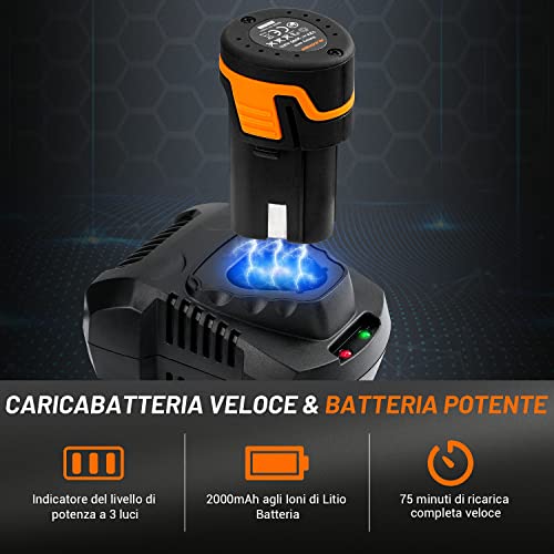 POTENTE TRAPANO AVVITATORE BATTERIA - Batteria agli ioni di litio da 2000 mAh potente e durevole, 75 minuti di ricarica rapida, ci sono Indicatore del livello di potenza a 3 luci che mostra quanta carica della batteria è rimasta, una ricarica rapida e duratura,leggero e portatile, è un aiuto indispensabile per il outdoor e la casa