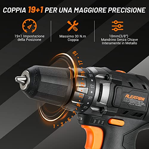 ALEAPOW Trapano Avvitatore Batteria, Avvitatore a Batteria, 10MM Mandrino Senza Chiave, 30N.m Max, 2000 mAh Batteria al Litio, 19+1 Impostazione della Posizione, 2 Velocità, 3 LED
