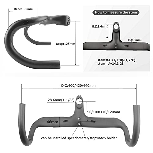1, larghezza del manubrio della bici da strada in carbonio: 400/420/440 mm, lunghezza dello stelo: 90/100/110/120 mm, diametro della forcella: 1-1/8 pollici (28,6 mm), pendenza: 125 mm, gamma: 95 mm .