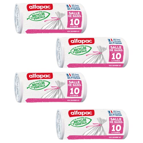 ALFAPAC - 25 sacchetti da 10 l con chiusura tradizionale - Sacchetti per la spazzatura per il bagno - Vegetal Origin - Confezione da 4 - Sacchetti bianchi di dimensioni 35 x 40 cm.