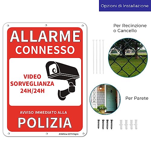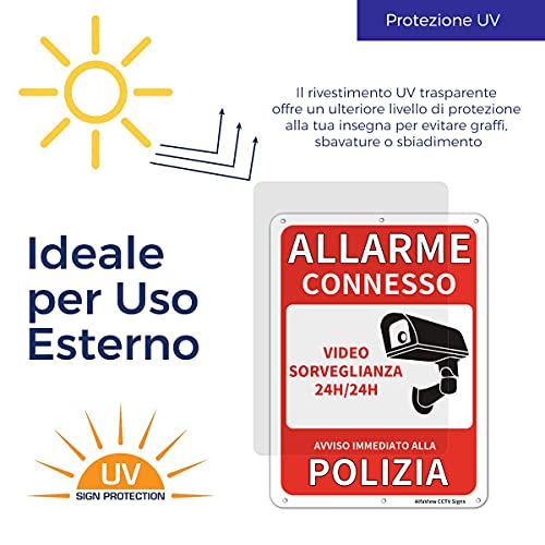 AlfaView Cartelli Videosorveglianza 24H/24H, Allarme Connesso Avviso Immediato Alla Polizia,Alluminio UV Protetto Riflettente Cartelli -25.4cmx17.8cm (1)