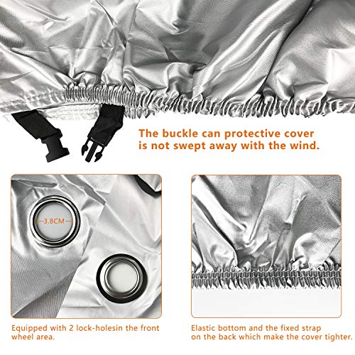 ✅【PROTEZIONE ANTIFURTO】Alfheim Bike Cover è dotato di 2 fori di bloccaggio nella zona della ruota anteriore. Può proteggere efficacemente la tua bici dal furto. Inoltre, Alfheim Bike Cover ha il fondo elastico e la cinghia fissa con fibbia sul retro, per rendere la bici più stretta in modo che la copertura protettiva non venga spazzata via dal vento.