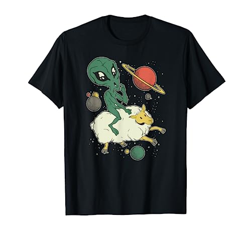 Fantastico disegno che mostra un alieno che cavalca una pecora.