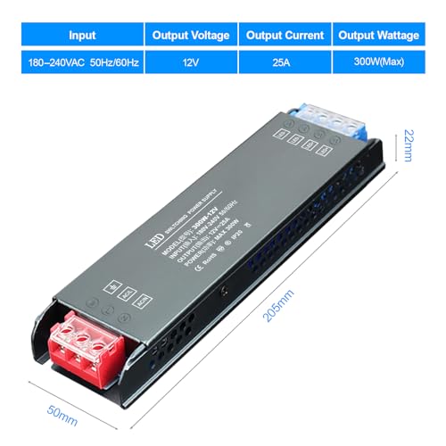 【Specifiche del trasformatore LED】: Ingresso: 180-240V AC, 50/60Hz. Uscita: 12V DC 25A 300W, bassa ondulazione, nessun cavo incluso.