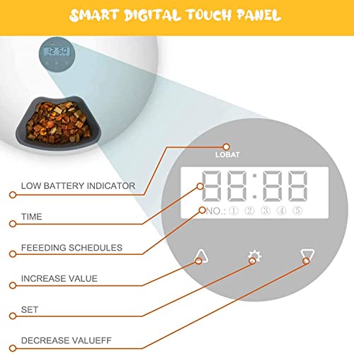 Display LCD: con l'alimentatore automatico è possibile creare un piano di alimentazione attraverso una programmazione semplice e di facile comprensione, molto adatta ai proprietari di animali domestici. Nota: 1. Tutte le impostazioni devono essere effettuate quando è sbloccata. Il display LCD è retroilluminato di blu. La mangiatoia automatica per gatti funziona ogni 24 ore.