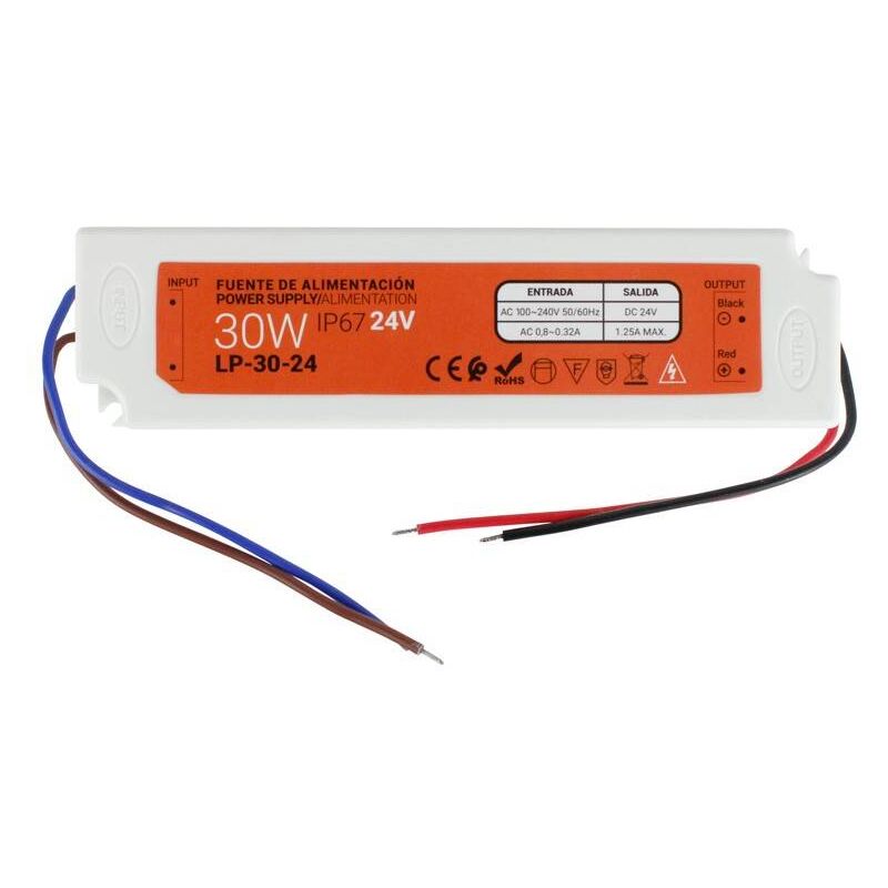 Alimentatore compatto impermeabile da 30W . Perfetto per uso esterno e interno, con grado di protezione IP67. Ideale per strisce LED e apparecchi a 24V. Uso professionale. Alimentazione con pre-cablaggio di ingresso e di uscita incluso. Alimentazione con pre-cablaggio incluso. Tensione d'uscita 24VDC. Potenza 30W. Amperaggio massimo di uscita 1.25A. Molto robusto e compatto. 24V-DC 30W 1.25 MAX. 1.25 MAX. 150x40x30mm IP67