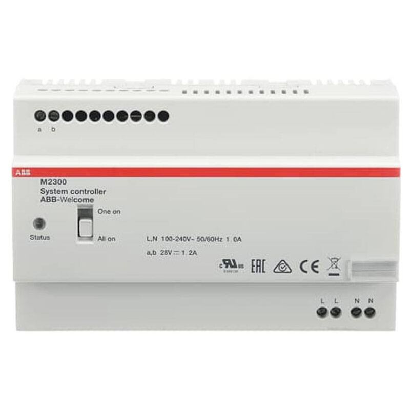 Alimentatore Controller per videocitofonia Abb M2300-101 8 Moduli, da 1200mA. Lo switch permette di selezionare la modalità ALL ON (tutti i posti interni in un appartamento squillano e mostrano l'immagine dal posto esterno, se qualcuno ha citofonato) oppure ONE ON (solo il posto interno MASTER squilla e mostra l'immagine, gli altri squillano solamente. NOTA: il posto interno che risponde alla chiamata vedrà l'immagine, anche se non è il MASTER). La modalità ONE ON è stata ottimizzata, rispetto al modello precedente, affinché un singolo alimentatore sia in grado di sostenere un maggior numero di posti interni. Caratteristiche: Tipo di corrente: DC Tensione d'ingresso (Uin): 230 V Tensione uscita (Uout): Nominal Value 1 20 V Corrente d'uscita massima (Iout): 1200 mA Frequenza (f): 50 Hz Grado di protezione: IP20 Dimensioni: Larghezza prodotto: 0.65 m - Altezza prodotto: 0.9 m - Profondità prodotto: 1.44 m Peso netto prodotto: 0.437 kg. Tipologia: Alimentatori
