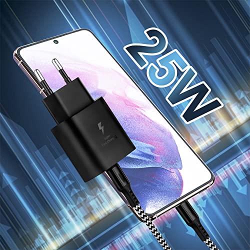 Alimentatore di rete rapido USB C da 25 W Compatibile con Samsung Galaxy S22/S21+/S21 Ultra/Z Flip 3/Z Fold 3 5G/S20/Note20/10/9/S10/Pad Pro 12.9, Con Cavo di Ricarica in Nylon di Tipo C, 2 m (Nero)