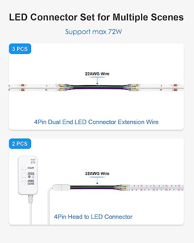 L'accessorio di collegamento LED a 4 pin è compatibile solo con PCB COB IP30 RGB da 10 mm di larghezza e PCB 2835 3528 SMD IP20 da 10 mm di larghezza. I cavi di prolunga da 22 AWG possono essere alimentati con un massimo di 12 ~ 24 V e 72 W.