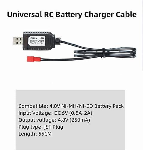 Carica sicura: Il cavo di ricarica della batteria ha funzioni di protezione da sovratensione, sovraccarico e cortocircuito. Prima dell'uso, assicurarsi che la tensione (4,8V) sia compatibile. L'input è DC 5V 2A, l'output è 4,8V 250mA, il connettore è USB a spina JST. Prima di effettuare un ordine, riconfermare la tensione della batteria e scegliere la taglia corretta.