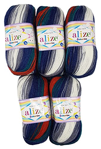 Alize bebe batik, 5 matasse di filato per bambini, da 100 g, totale 500 g, acrilico, colore rosso, blu, verde e grigio, per maglia e uncinetto, N. 6301