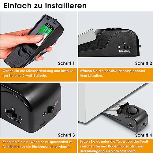 【Facile da Usare】 Non è necessario forare, è sufficiente una batteria standard da 9V (non inclusa). È sufficiente tenere in mano questo fermaporta, selezionare il livello di sensibilità desiderato e posizionarlo sotto la porta. Lo spazio tra la porta e il pavimento deve essere compreso tra 10 mm (0,38 pollici) e 35 mm (1,35 pollici). Se lo spazio è superiore a 35 mm, posizionare un materiale morbido sotto il fermaporta.