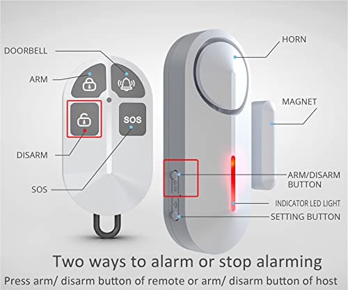Questo kit include 2 host di allarme porta e 1 telecomando. Ci sono due modi per armare o disarmare, è facile da controllare entro 100 M dal telecomando, inoltre puoi usare l'host per armare/disarmare. L'host invierà un allarme ad alto volume con una luce rossa lampeggiante che durerà per 60 secondi quando la porta si aprirà improvvisamente.